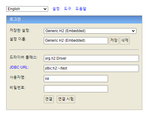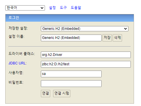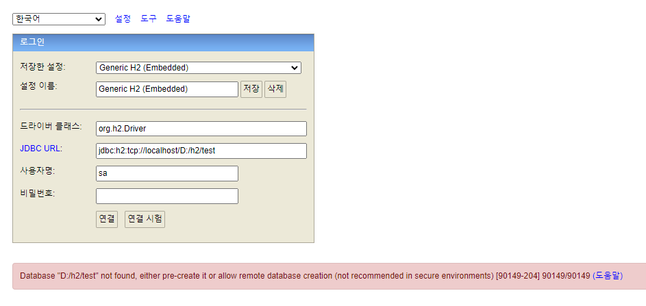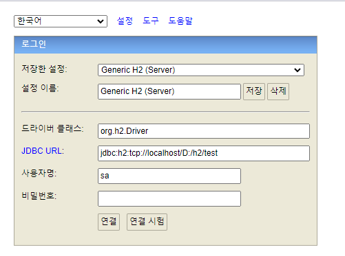 jdbc:h2:D:/h2/test를 입력후 반드시 연결 시험을 누르지 않고 연결을 바로 눌러야 생성이된다!