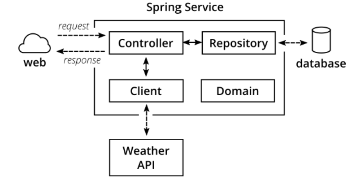 @RunWith(SpringRunner.class) @SpringBootTest public class WeatherClientIntegrationTest { @Autowired private WeatherClient subject; @Rule public WireMockRule wireMockRule = new WireMockRule(8089); @Test public void shouldCallWeatherService() throws Exception { wireMockRule.stubFor(get(urlPathEqualTo("/some-test-api-key/53.5511,9.9937")) .willReturn(aResponse() .withBody(FileLoader.read("classpath:weatherApiResponse.json")) .withHeader(CONTENT_TYPE, MediaType.APPLICATION_JSON_VALUE) .withStatus(200))); Optional<WeatherResponse> weatherResponse = subject.fetchWeather(); Optional<WeatherResponse> expectedResponse = Optional.of(new WeatherResponse("Rain")); assertThat(weatherResponse, is(expectedResponse)); } }- 서비스와 Integration Test 를 하는 부분